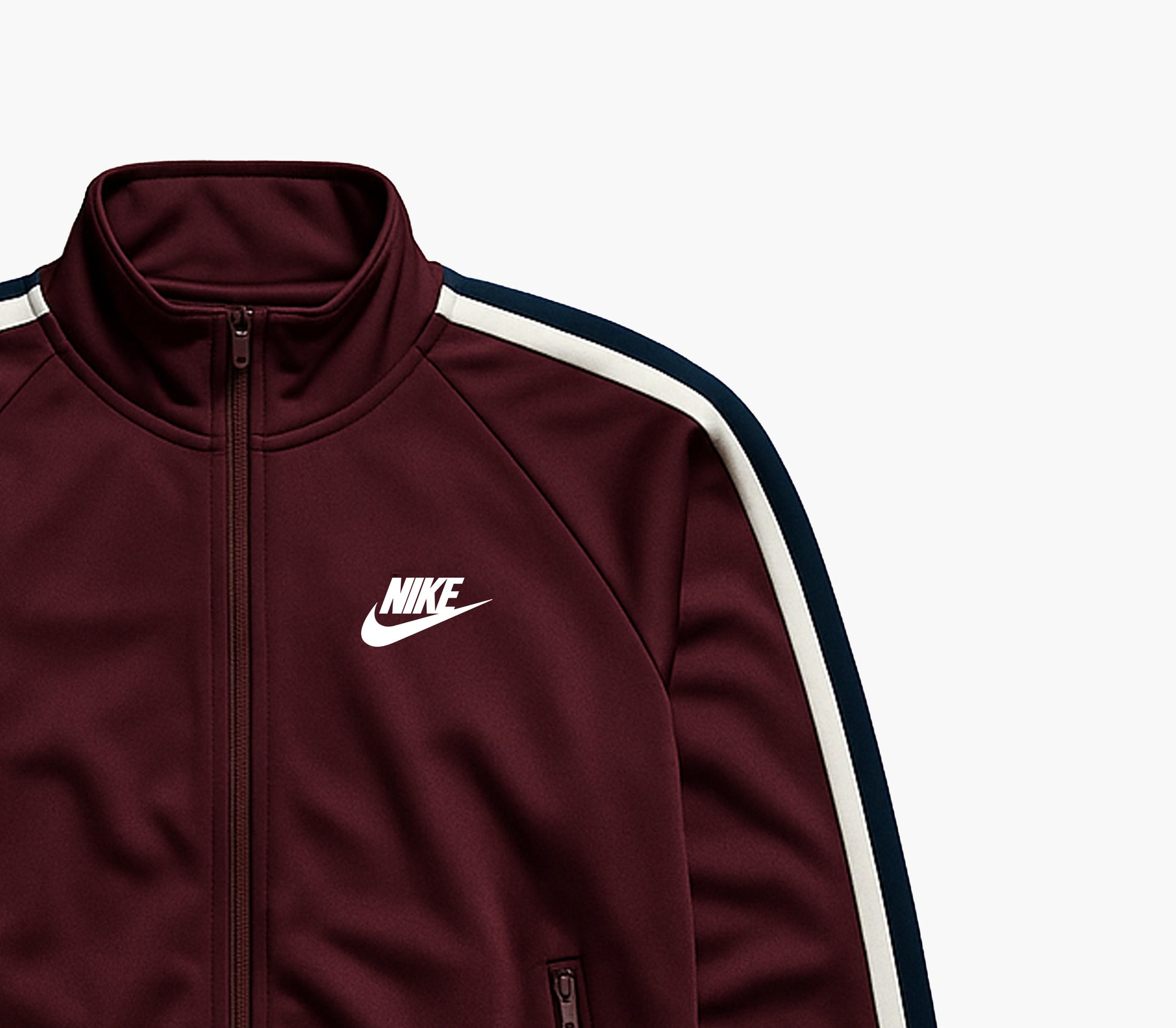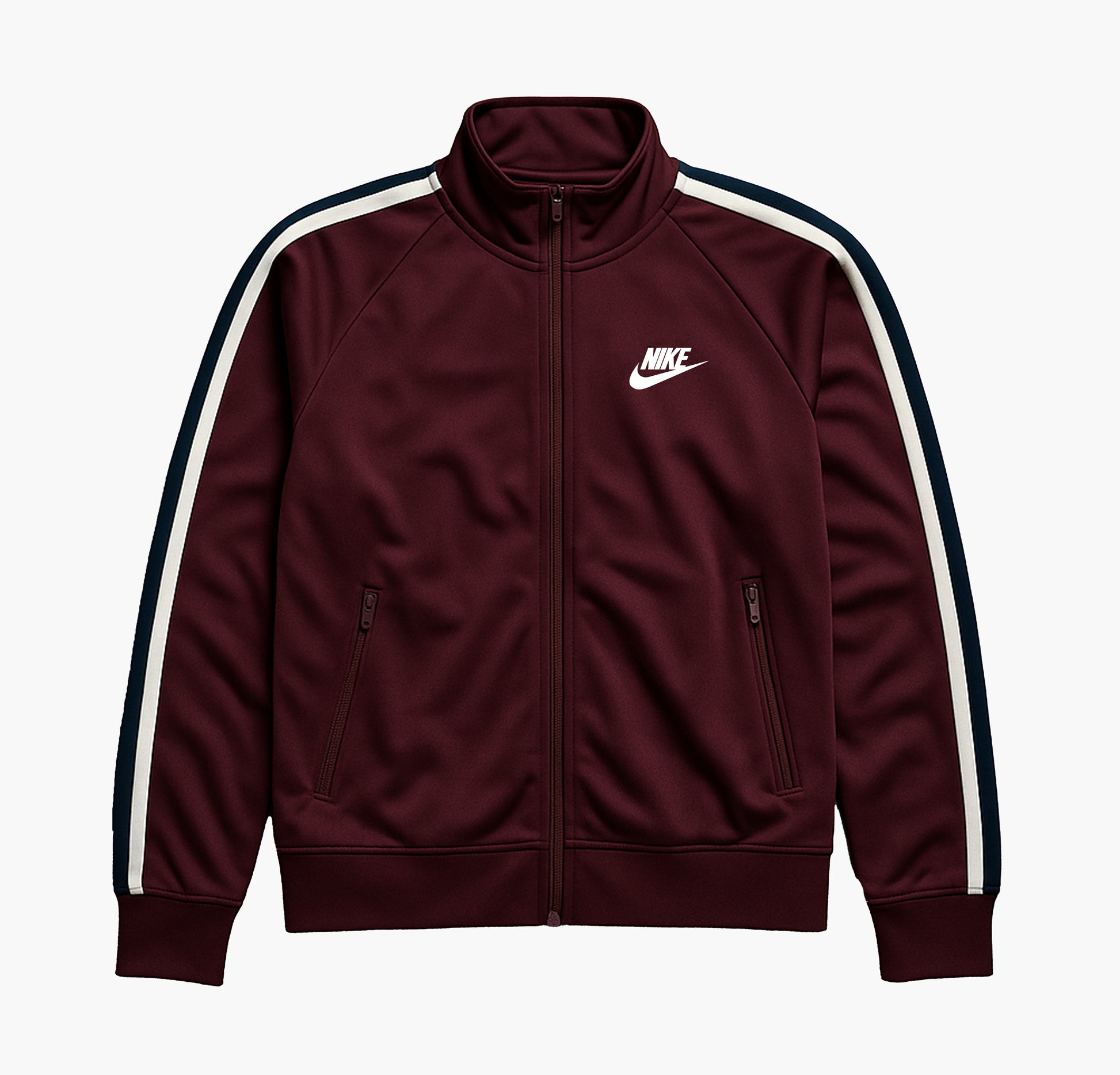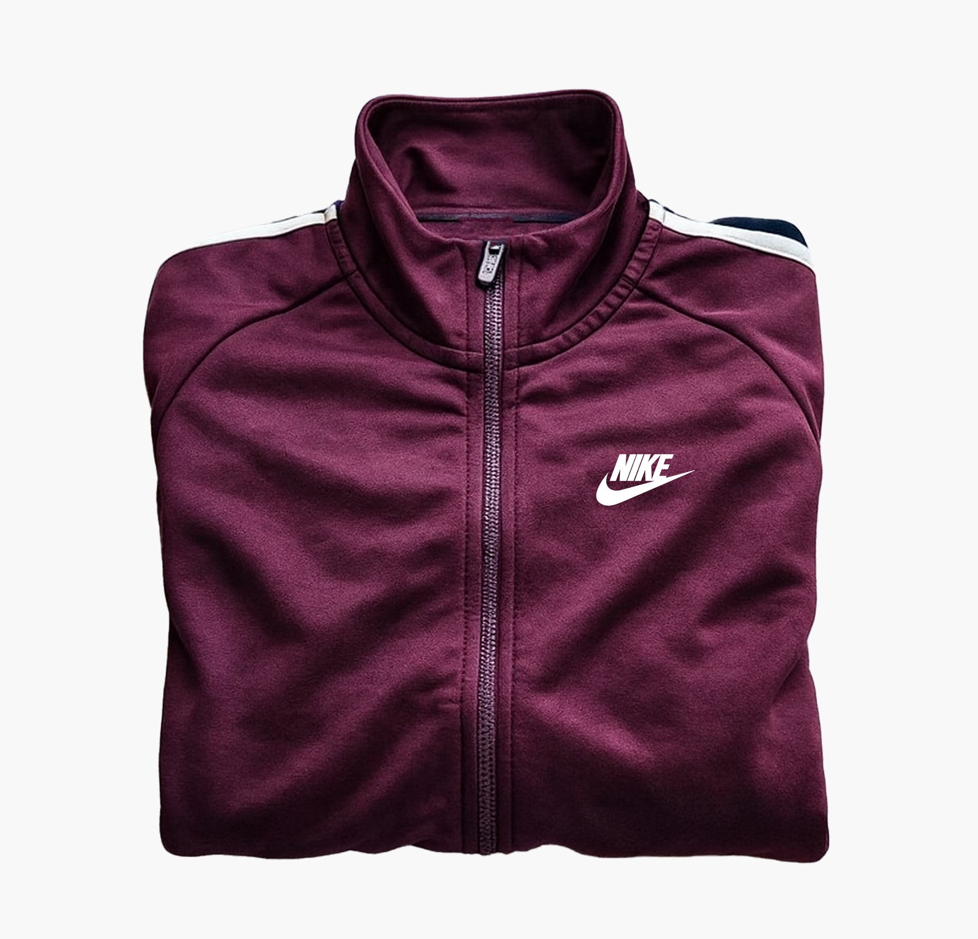 Details: Classic Nike track jacket in a burgundy, navy, and white color combination, featuring a smooth full-length zipper and practical side pockets. Offers a comfortable athletic fit and a clean sporty look, perfect for everyday wear or training. The jacket is in good condition with light signs of use but remains fully functional and well maintained.