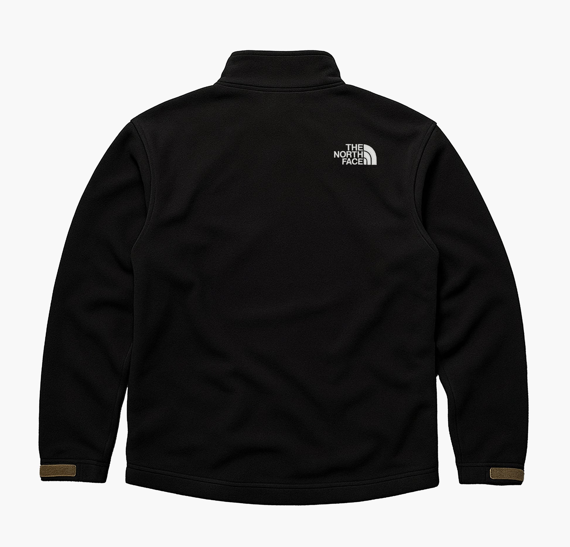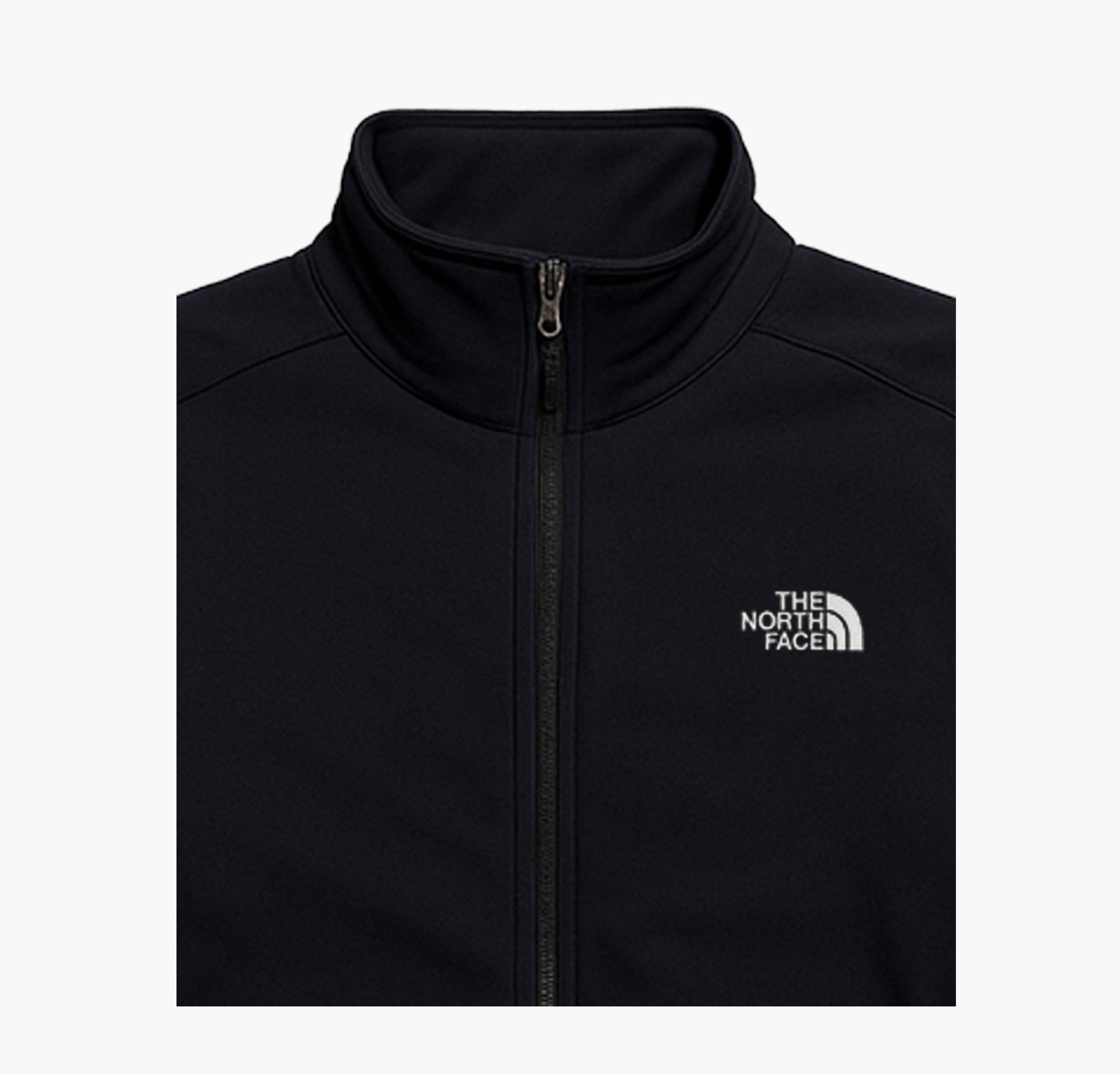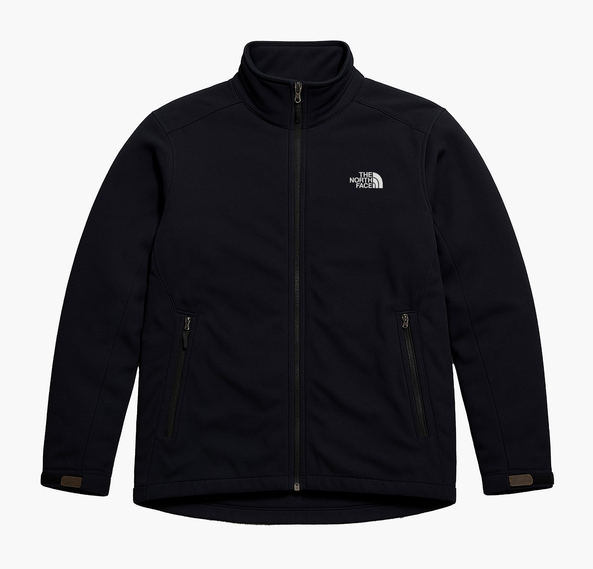 Details: Men’s The North Face softshell jacket, windproof and water-repellent polyester material, black outer shell with grey inner lining, full-zip closure with chin guard, two zippered front pockets, adjustable sleeve cuffs with Velcro, embroidered logos on the front and back, functional and comfortable design, lightly worn and in good overall condition with no holes or tears